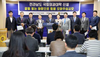 전남도의회 소속 의원들이 17일 전남 국립 의대 신설과 관련해 \'갈등 없는 화합\'을 강조했다.