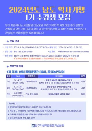 참가 신청은 4월 24일부터 5월 8일까지 광주학생독립운동기념회관 누리집(https://lib.gen.go.kr/student)에서 회원가입 후 가능하며 선착순 20명을 모집한다. 1·2회차 강연 모두 참석한 수강생에 한하여 3회차 탐방 기회가 주어지며 참가비는 무료이다.