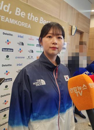 임시현이 17일 충북 진천선수촌 챔피언하우스에서 2024 파리 올림픽 D-100 국가대표 격려행사 \'원 팀(ONE TEAM)! 원 드림(ONE DREAM)!\'을 마친 뒤 인터뷰를 하고 있다. 2024.04.17