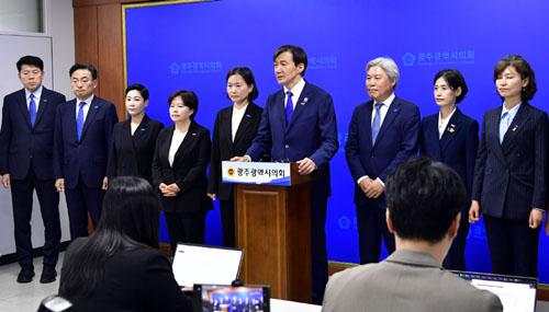 조국혁신당 조국 대표와 당선인들이 23일 오전 광주시의회에서 기자간담회를 하고 있다.