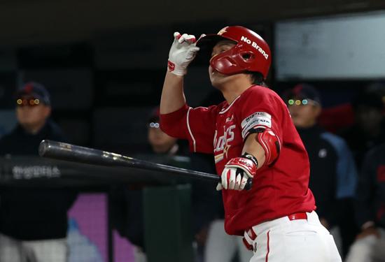 최정은 5회초 2사 주자 없는 상황에서 롯데 선발 이인복의 초구 슬라이더를 잡아당겨 좌월 솔로 홈런을 터뜨렸다.