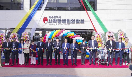 강기정 광주시장이 26일 오후 남구 ‘광주시각장애인연합회 복지회관 준공식’에 참석해 김병내 남구청장 등 내빈들과 테이프커팅을 하고 있다./광주광역시 제공