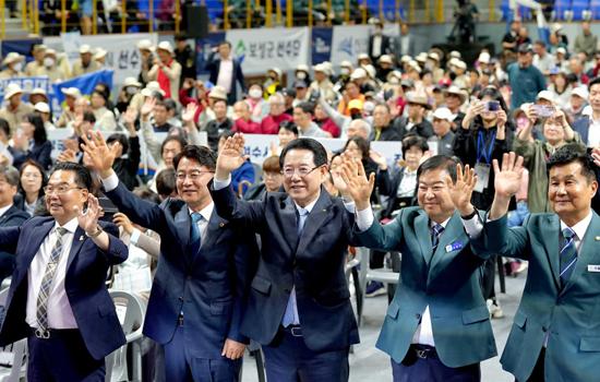 김영록 전남도지사(가운데)가 29일 오후 영광스포티움 국민체육센터에서 열린 제32회 전라남도 장애인체육대회 개회식에서 입장하는 선수단을 환영하고 있다. /전남도 제공