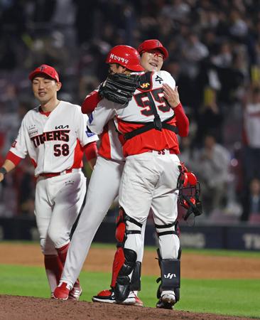 1일 광주기아챔피언스필드에서 열린 프로야구 kt wiz와 KIA 타이거즈의 경기, 9이닝 8피안타 1실점으로 완투승을 거둔 KIA 선발 양현종이 포수 한준수와 포옹하고 있다. /KIA 타이거즈 제공 2024.05.01.