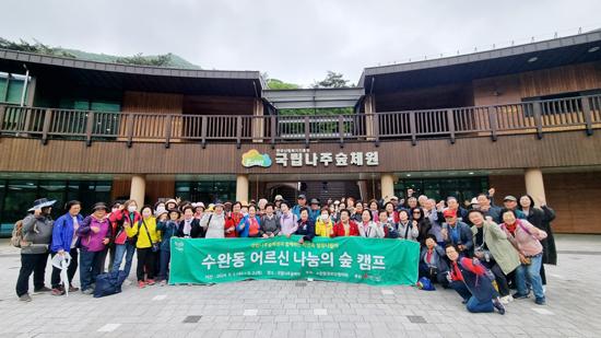 수완동은 지난 1~2일 국립나주숲체원에서 어르신 90여 명과 나눔의 숲 캠프를 진행했다. 수완동과 국립나주숲체원의 업무협약 이후 첫 사업으로, 어버이날을 기념해 지역 어르신들을 위한 자연 속 힐링의 시간을 마련한 것이다.
