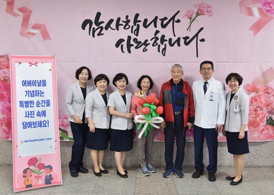 병원 1층 로비에는 외래 진료 환자 또는 보호자들이 함께 기념사진을 촬영할 수 있는 \'어버이날 기념 포토존\'이 마련됐다. 포토존에선 다양한 머리띠와 하트 풍선 등 소품을 이용해 자유롭게 촬영할 수 있어 큰 호응을 얻었다.