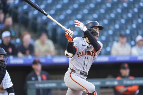 샌프란시스코 자이언츠의 이정후가 7일(현지시각) 미 콜로라도주 덴버의 쿠어스 필드에서 열린 2024 메이저리그(MLB) 콜로라도 로키스와의 경기 1회 초 선두타자로 나와 우전안타를 치고 있다. 2024.05.08.