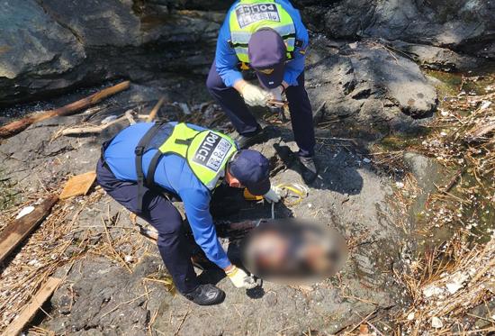 여수해양경찰이 10일 여수시 돌산읍 방죽포해수욕장 인근에서 발견된 토종고래 상괭이 사체를 조사하고 있다. /해양환경인명구조단 제공