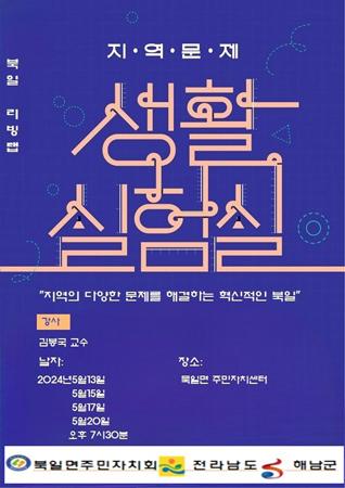 해남군 북일면주민자치회에서는 전남도와 해남군의 후원으로 2024 지역행복 문화강좌 \'즐거운 LIVING 설계 ‘행복한 삶 All來!’를 오는 5월 13일, 15일, 17일, 20일 오후 7시 30분 북일면주민자치센터에서 개최한다.