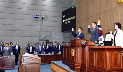 본회의 개회에 앞서 시의회 본회의장에는 제44회 5·18민주화운동을 기념하는 \'임을 위한 행진곡\' 음악이 힘차게 울려퍼졌다.