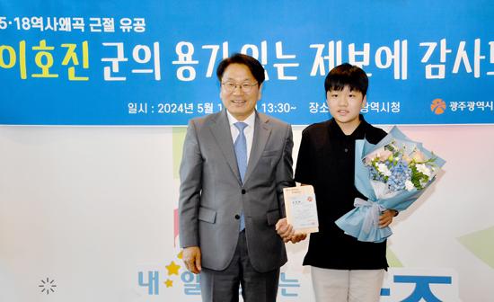 강기정 광주시장은 13일 오후 광주 서구 광주시청 접견실에서 5·18 왜곡·폄훼 게임을 발견하고 제보한 부산의 한 초등학교 이호진(12)군에게 감사 표창을 전달했다.