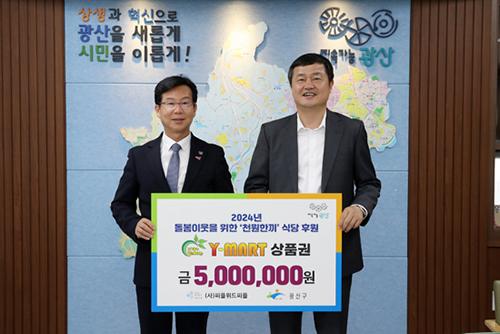 ‘와이마트’ 부설 사단법인 피플위드피플이 16일 광산구 ‘천원한끼’ 식당 운영을 돕기 위해 500만 원 상당의 ‘와이마트 상품권’을 후원했다.