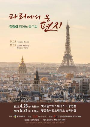 광주대학교는 김정아 교수의 피아노독주회 \'파리에서 온 편지\' 두 번째 공연이 오는 21일 오후 7시 30분 빛고을아트스페이스 소공연장에서 열린다고 17일 밝혔다.