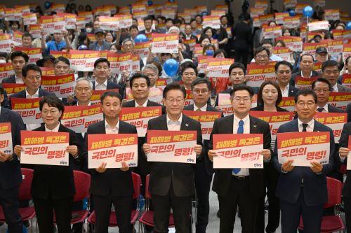 이재명 더불어민주당 대표와 박찬대 원내대표 등 당 지도부가 지난 18일 오후 광주 김대중컨벤션센터에서 열린 \'당원과 함께, 민주당이 합니다\' 호남 콘퍼런스에서 당원들과 피케팅 퍼포먼스를 하고 있다.