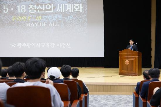 이정선 교육감이 5·18 민주화운동 제44주년을 맞아 17일 5·18 당시 3명의 학생이 희생된 광주동성고에서 ‘학교로 찾아가는 5·18 계기교육’ 강사로 직접 나섰다.