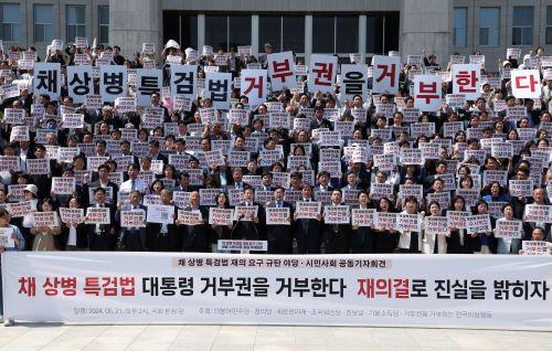 이재명 더불어민주당 대표와 조국 조국혁신당 대표 등 야권 관계자들과 시민사회단체 회원들이 21일 서울 여의도 국회 앞 계단에서 열린 채 상병 특검법 재의 요구 규탄 야당, 시민사회 공동기자회견에서 피켓을 들고 구호를 외치고 있다.