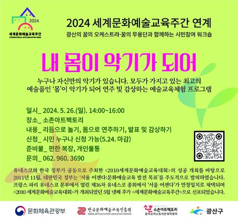 광주 광산구는 26일 오후 2시 소촌아트팩토리에서 ‘2024 세계문화예술교육주간’과 연계해 꿈의 오케스트라와 꿈의 무용단이 함께하는 시민참여 행사(워크숍), ‘내 몸이 악기가 되어’를 개최한다고 밝혔다.