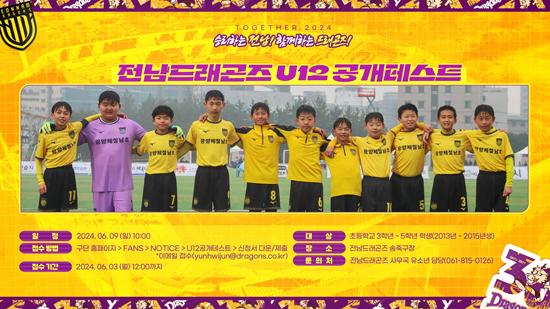 한국축구의 화수분 역할을 하고 있는 전남드래곤즈가 잠재력을 가진 축구 유망주를 조기 발굴하기 위해 U12 공개테스트를 진행한다.