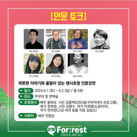 광주 동구는 \'제2회 무등산 인문축제-인문 포:레스트(For:rest)\'에 배우 봉태규와 김용택 시인 등 명사를 초청한 강연을 진행한다고 22일 밝혔다.