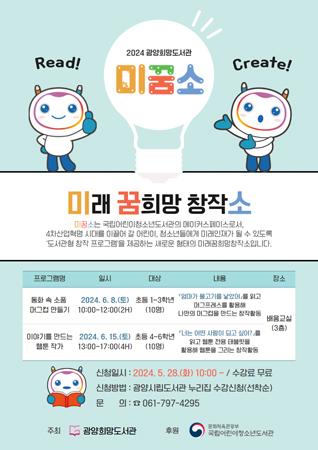 광양희망도서관이 오는 6월 8일과 15일, 초등학생을 대상으로 도서관형 창작 프로그램인 미래꿈희망창작소(이하 미꿈소) 프로그램을 운영한다고 밝혔다.