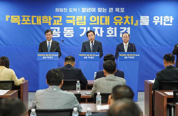 박홍률 목포시장과 송하철 목포대 총장, 문차복 목포시의회 의장은 이날 오전 목포시청에서 공동기자회견을 갖고 \"목포시는 지난 34년간 정부에 국립 의과대학과 대학병원 유치를 요구했다\"면서 이같이 밝혔다.