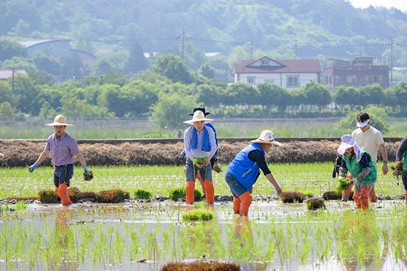 이날 행사에는 주민들과 각종 유관단체, 자원봉사자 및 별량중학교 학생 등 300여 명과 함께 노관규 순천시장이 직접 모내기 체험행사에 참여했다.