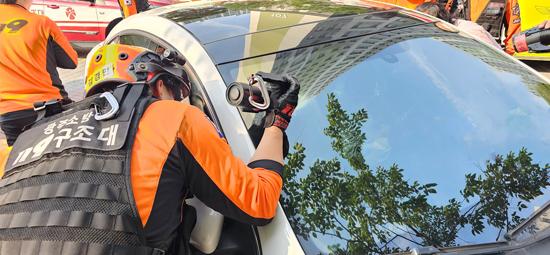 광주 북부소방서 119구조대가 지난 22일 오후 연제동 한 아파트 주차장에서 차량 안에 갇힌 3살 아이를 구조하고 있다. /광주 북부소방서 제공