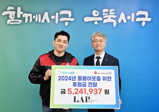 광주시 서구는 23일 의류브랜드 LAP(랩)을 운영하고 있는 JC FAMILY로부터 돌봄이웃을 위한 후원금을 전달받았다.
