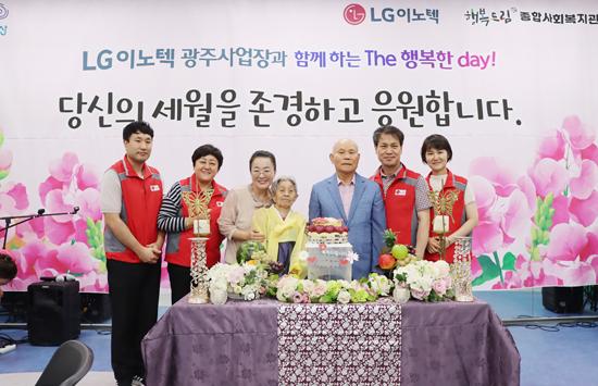 거동이 어려워 생신 잔치에 참여하지 못한 어르신에 대해선 LG이노텍 광주사업장 임직원과 이현숙 행복드림종합사회복지관 관장은 직접 세대를 방문해 축하 인사와 선물을 전달했다.