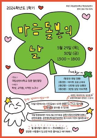 국립순천대 \'마음돌봄의 날\' 행사는 접근성이 좋은 야외에서 상담 참여 기회를 확대하고 여러 마음 건강 관련 정보를 제공하기 위해, 지난해 교내 곳곳에서 소규모로 운영하던 것을 올해는 순천시 마음 건강 관련 기관들과 협력해 확대 개최한다. 행사는 국립순천대 학생상담센터가 주관하고, 국립대학육성사업의 일환으로 열린다.