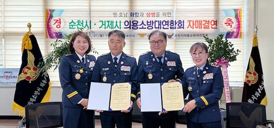 순천소방서는 지난 27일 의용소방대연합회 사무실에서 순천시 의용소방대와 거제시 의용소방대의 영·호남 자매결연 협약식을 가졌다.