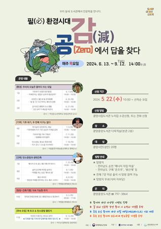광양중앙도서관이 문화체육관광부 공모사업인 2024 도서관 길 위의 인문학 프로그램에 11년 연속 사업 수행기관으로 선정돼 오는 6월 13일부터 ‘필(必) 환경 시대 공(Zero) 감(減)에서 답을 찾다’라는 주제로 프로그램을 운영한다고 밝혔다.