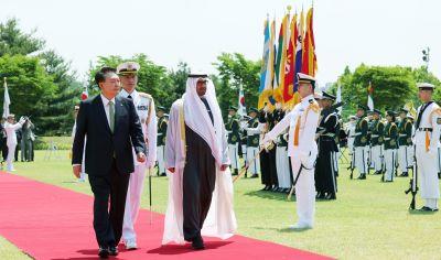 윤석열 대통령과 모하메드 빈 자예드 알 나흐얀 아랍에미리트연합국(UAE) 대통령이 29일 서울 용산 대통령실 잔디마당에서 열린 국빈 방한 공식 환영식에서 의장대를 사열하고 있다.