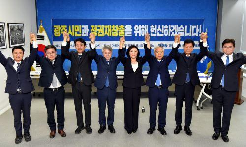 제22대 총선에서 당선된 광주지역 더불어민주당 국회의원 8명이 30일 오전 민주당 광주시당에서 기자회견을 갖고 \'원팀\'으로 지역발전에 헌신하겠다고 다짐하고 있다. /광주시당 제공