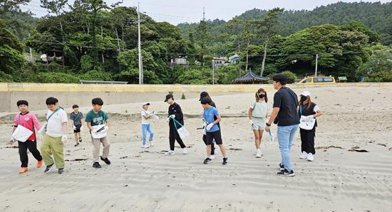 지난달 31일 노화중앙초등학교와 보길동초등학교 학생들이 정부재, 소장호 교사와 함께 보길면 중리 해수욕장을 찾아 환경정화 활동을 펼쳤다.