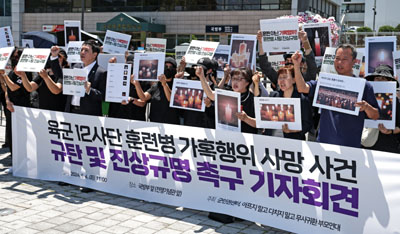 군인권센터와 아프지 말고 다치지 말고 무사귀환 부모연대 회원들이 4일 오전 서울 용산구 국방부 앞에서 \'육군 12사단 훈련병 가혹행위 사망 사건 규탄 및 진상규명 촉구 기자회견\'을 열고 구호를 외치고 있다.