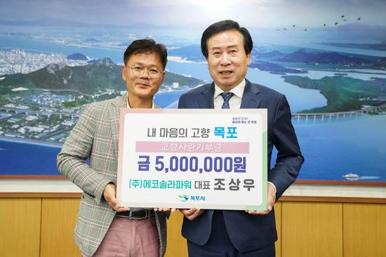 ㈜에코솔라파워 조상우 대표가 지난 3일 목포시에 고향사랑 기부최고액 500만원을 기탁했다.