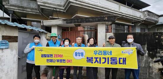 중앙동 우리동네 복지기동대는 복지사각지대를 발굴하고 취약계층의 생활 불편을 해소하기 위한 봉사단체로 주거환경을 개선하고, 생활안정 지원서비스를 제공하는 등 다양한 활동을 하고 있다. 상반기에는 생활환경이 취약한 14가구에 집수리 봉사활동을 펼쳤다.