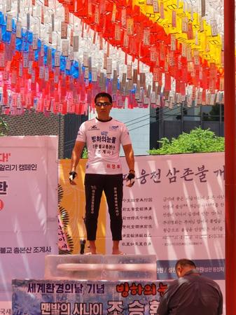 이번 도전은 세계환경의 날을 기념해 대한불교 조계종 총 본사 초청으로 진행되었으며, 많은 인파가 몰려 맨발의 사나이 조승환의 신기록 도전을 응원했다.