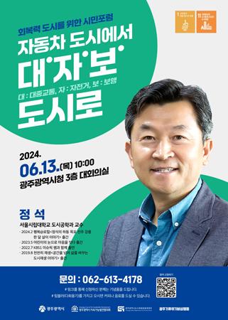 광주시는 13일 오전 10시 시청 대회의실에서 도시재생·도시설계 석학 정석 교수(서울시립대 도시공학과)를 초빙해 ‘회복력 도시를 위한 시민포럼 자동차 도시에서 대·자·보(대중교통·자전거·보행) 도시로’를 주제로 특별강연을 개최한다.