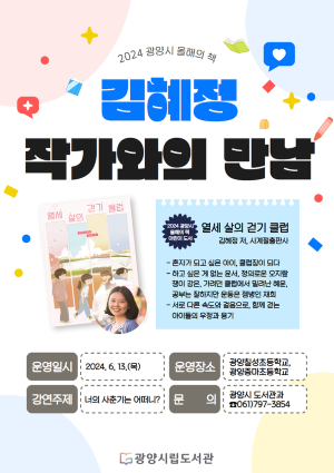 광양시립도서관은 13일 광양칠성초등학교, 중마초등학교에서 5~6학년 초등학생 114명을 대상으로 올해의 책 어린이 도서 ‘열세 살의 걷기 클럽’의 저자 김혜정 작가와의 만남을 개최한다고 밝혔다.