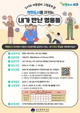 광주시 서구는 다음달 15일까지 아동권리 존중과 인식제고를 위한 ‘착한도시를 지키는, 내가 만난 영웅들’ 그림 공모전을 진행한다.