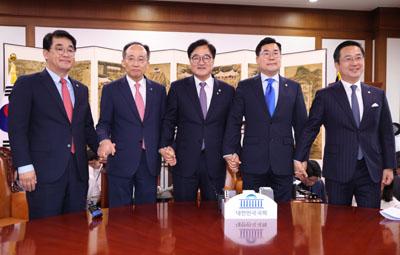우원식(가운데) 국회의장이 17일 서울 여의도 국회 의장실에서 22대 국회 원구성 관련 논의를 위해 추경호(왼쪽 두번째) 국민의힘, 박찬대(왼쪽 네번째) 더불어민주당 원내대표와 회동하고 있다.