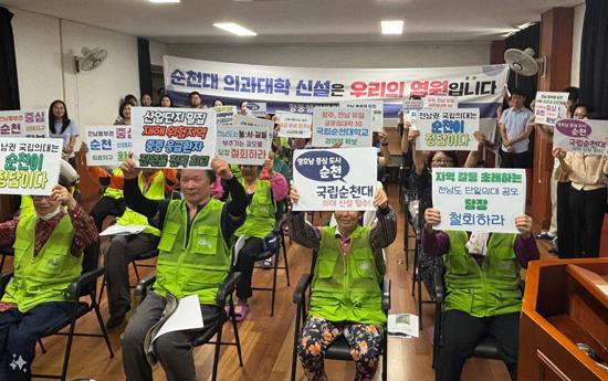 전남도가 국립의대 공모 용역사를 선정하고 속도를 내는 가운데, 순천시 향동 주민 80여 명이 모여 전남도의 국립의대 추천 공모 절차에 대한 반대 목소리를 높이며 순천대학교 의과대학 유치 결의를 다졌다고 밝혔다.