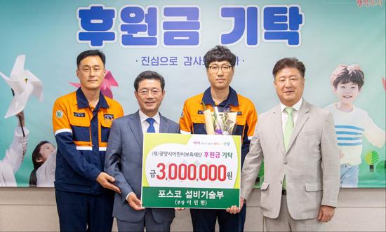 광양제철소 설비기술부는 지난 25일, 광양시청에서 기부금 전달식을 열고 광양시 어린이보육재단에 300만원을 전달했다. 이번 행사는 지난 5월 22일 진행됐던 부서 소통행사인 ‘사랑나눔 호프(Hope)데이’에서 발생한 수익금 1000만원 중 일부인 300만원을 지역 어린이 복리증진에 쓰일 수 있도록 전달하기 위해 진행됐다.