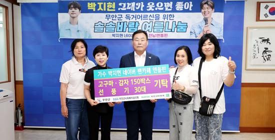무안군은 지난 26일 미스터트롯 가수 박지현의 팬카페 전남‘엔돌핀’이 독거어르신을 위해 고구마·감자 150박스와 선풍기 30대를 무안군 사회복지협의회에 기탁했다고 밝혔다.