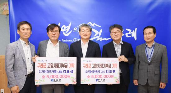 전남 구례군은 디자인파크개발 김요섭 대표와 소담이앤씨 김도연 이사가 지난 26일 구례군에 고향사랑기부금 최고액인 500만 원을 각각 기탁했다고 밝혔다.