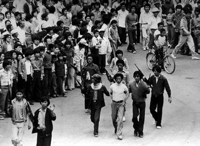 총을 든 청년들이 1980년 5월 24일 프락치나 간첩으로 의심되는 청년의 손을 뒤로 묶고 시민이 지켜보는 가운데 전남도청으로 연행하고 있다. /한국일보 제공