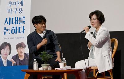 지난달 28일 오후 광주 동구 광주극장에서 열린 \'시대를 논하다\' 토크쇼에서 (오른쪽부터)추미애 더불어민주당 국회의원과 박구용 전남대학교 교수가 대화하고 있다.