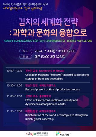 심포지엄에서는 김치의 세계화를 위해 전수진 미국 하와이대 교수가 \'진동 자기장을 이용한 과채류의 과냉각 저장\'에 대해 주제 발표한다.